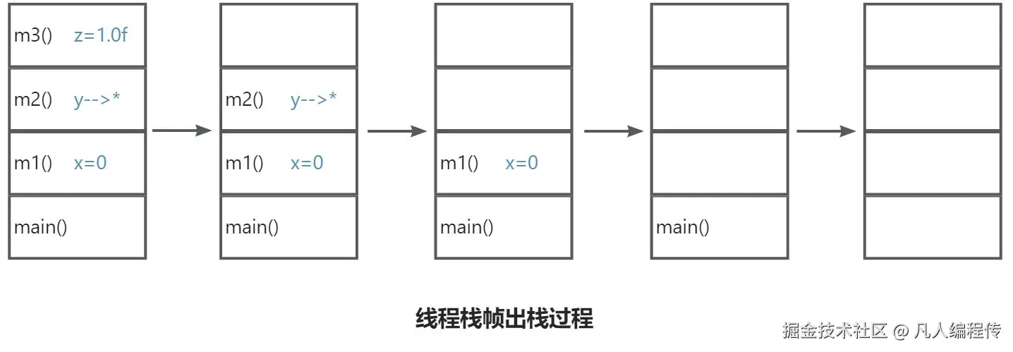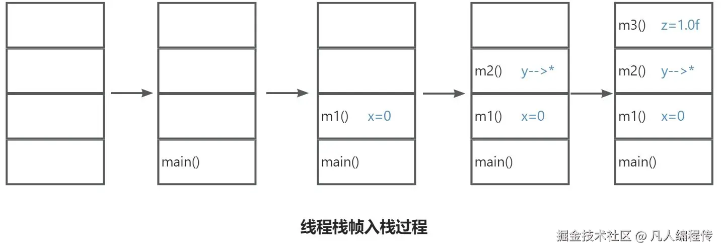 - 最后,m3() 方法入栈,声明 float 类型变量 z = 1.0f。同理,z 和 1.0f 都被存储在栈帧里。
