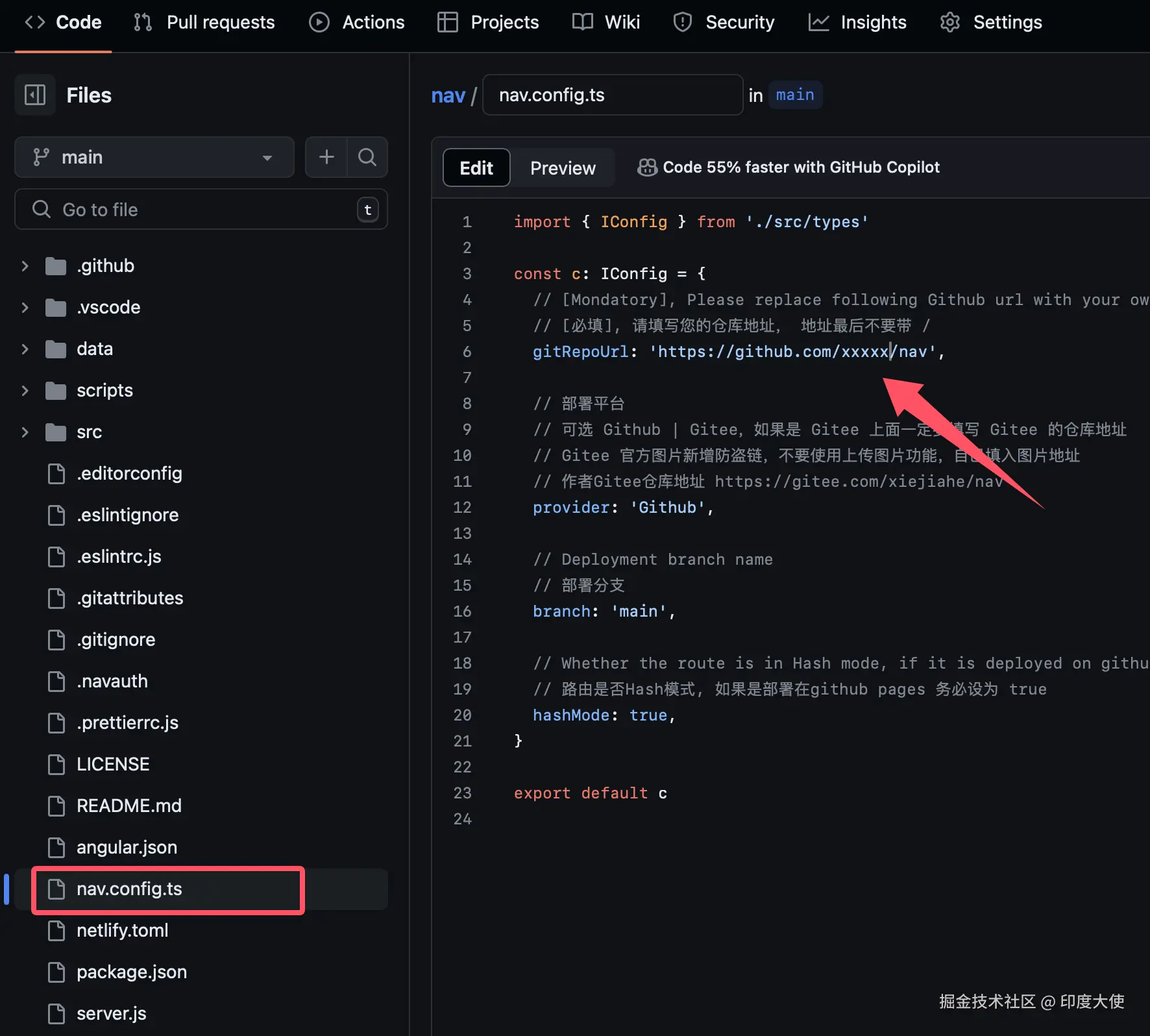 6、编辑根目录 nav.config.ts 文件,只需要修改仓库地址,把ID改成Github ID