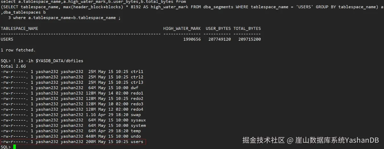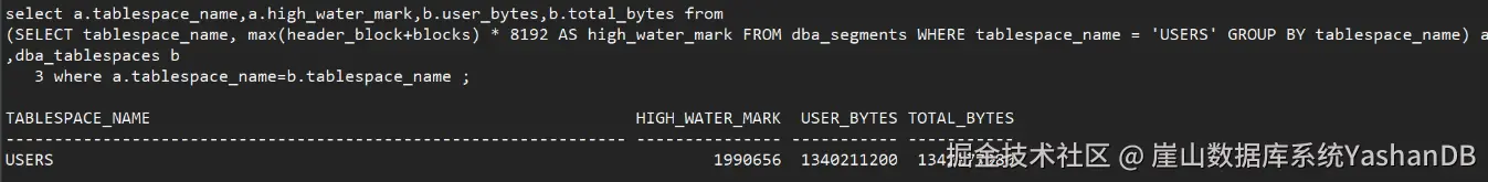 (SELECT tablespace_name, max(header_block+blocks) * 8192 AS high_water_mark FROM dba_segments WHERE tablespace_name = 'USERS' GROUP BY tablespace_name) a,dba_tablespaces b