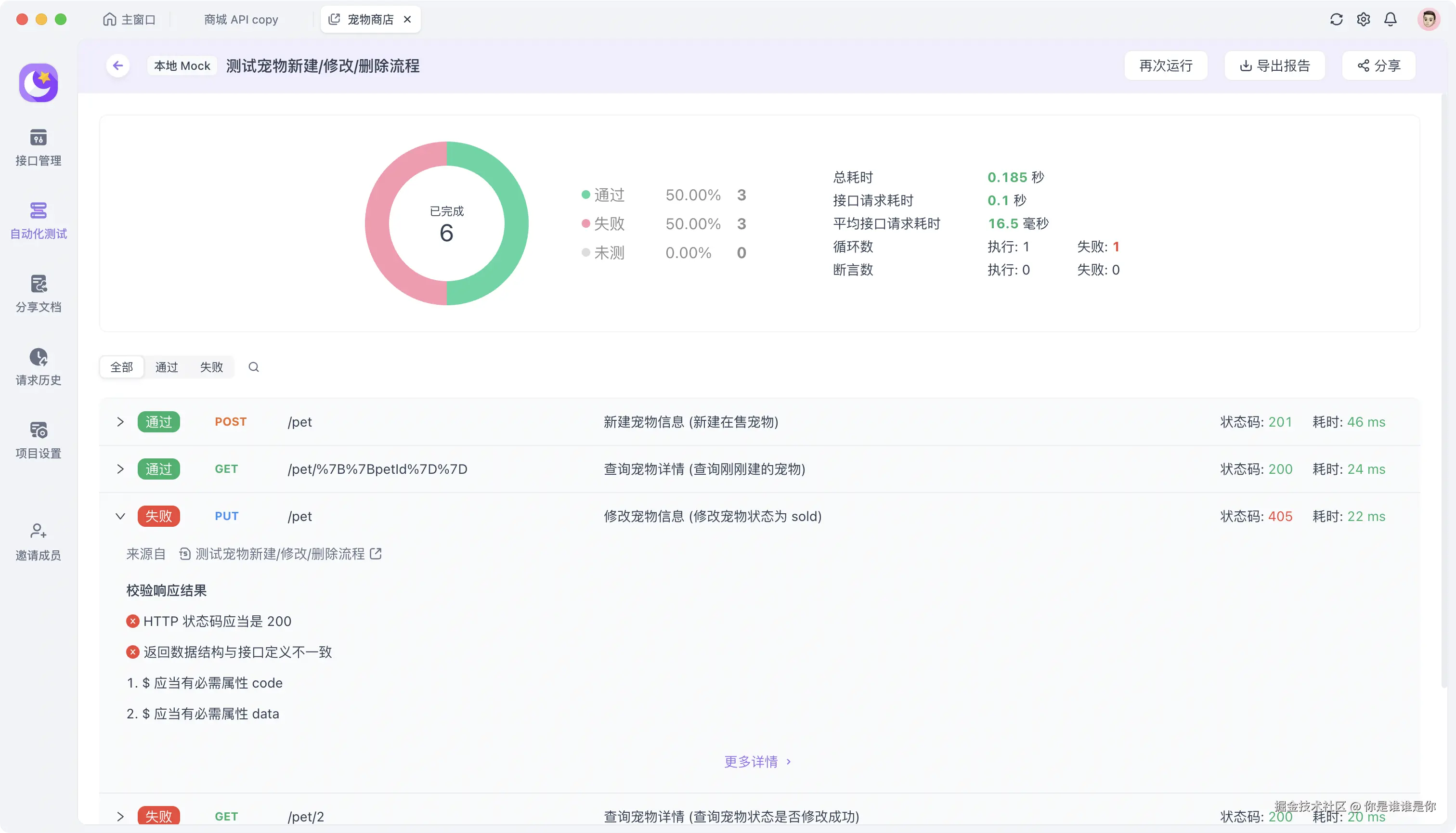 Apifox 允许用户为每个 API 创建详细的测试用例。你可以设置各种断言来验证 API 的响应,包括状态码、响应头、响应体等。例如,你可以断言某个 GET 请求应该返回 200 状态码,响应体应该包含特定的字段等。这些测试可以手动运行,也可以集成到自动化测试流程中。
