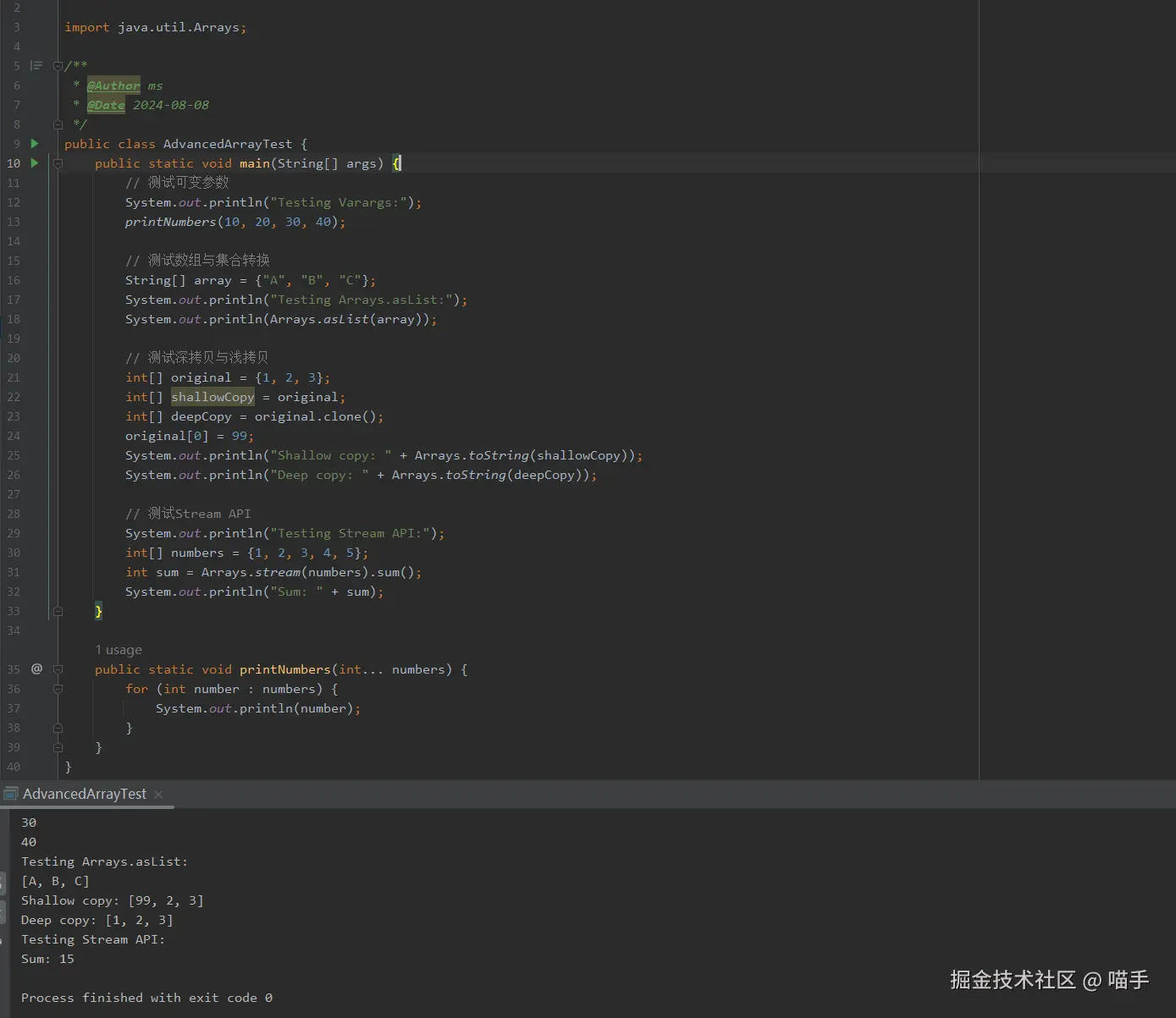 这些测试用例涵盖了可变参数、数组与集合转换、深拷贝与浅拷贝,以及Stream API的使用。通过这些测试,我们可以验证代码的正确性,并深入理解这些高级特性在实际开发中的应用。