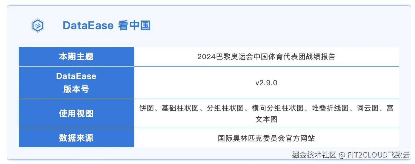 在本文中,我们使用DataEase开源数据可视化分析工具来盘点中国体育代表团在巴黎奥运会的辉煌战绩,以此向为梦想而拼搏的中国体育健儿致敬。