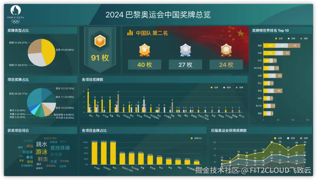 下图是使用DataEase开源数据可视化分析工具(*github.com/dataease *)制作的“2024巴黎奥运会中国奖牌总览”主题数据大屏。