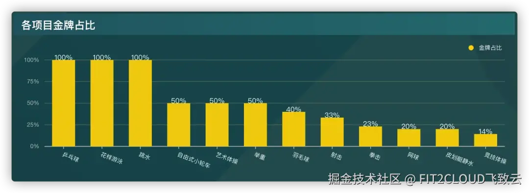 在衡量一个国家在某个比赛项目中的实力时,通常会用到“各项目金牌占比”的概念。“各项目金牌占比”的计算公式为:获得金牌数/比赛项目小项数*100%。其中,“比赛项目小项数”意为每个比赛项目下分设的小项数量。