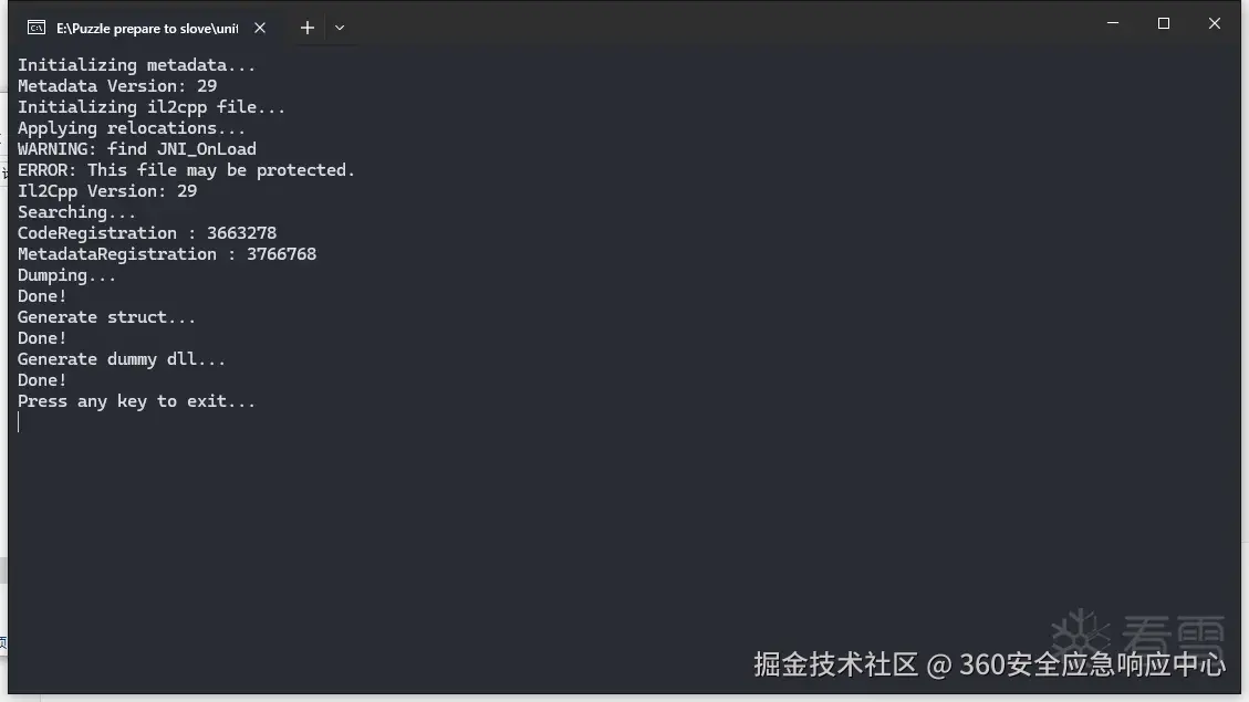 根据刚刚的源码分析,我们也能发现iL2cppDumper的操作,运行Il2CppDumper.exe依次选择libil2cpp.so以及global-metadata.dat,运行完成后显示如下界面(其实可以发现其输出界面和我们刚刚的流程是一致的)