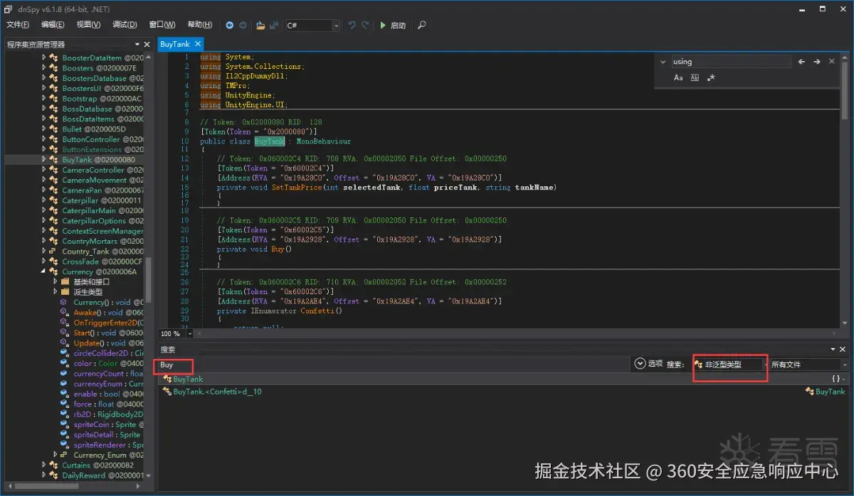 我们使用搜索功能(CTRL+F),这里还需要注意的是我们需要选择非泛型类型,这个其实就是找类了,熟悉开发的同学应该可以明白,很多功能都是在类中实现的。那么对于这个demo我们很快就搜索到了BuyTank类,我们可以点进去看看类里面有一些什么方法。