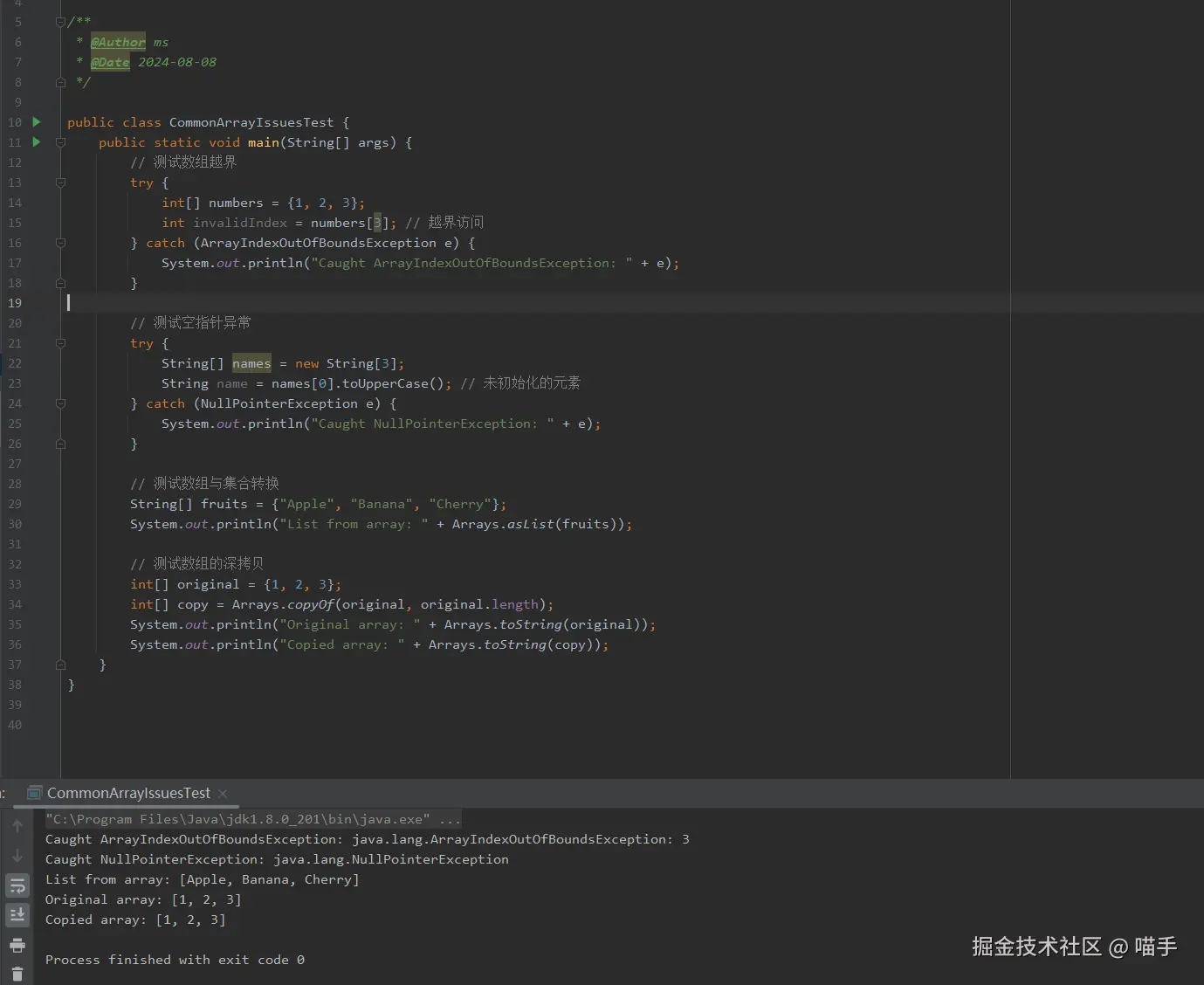 这段代码展示了在Java中处理数组时常见的一些问题,并通过不同的示例来测试如何捕获和处理这些问题,包括数组越界异常、空指针异常、数组与集合的转换,以及数组的深拷贝。下面我们逐一解析这些示例。