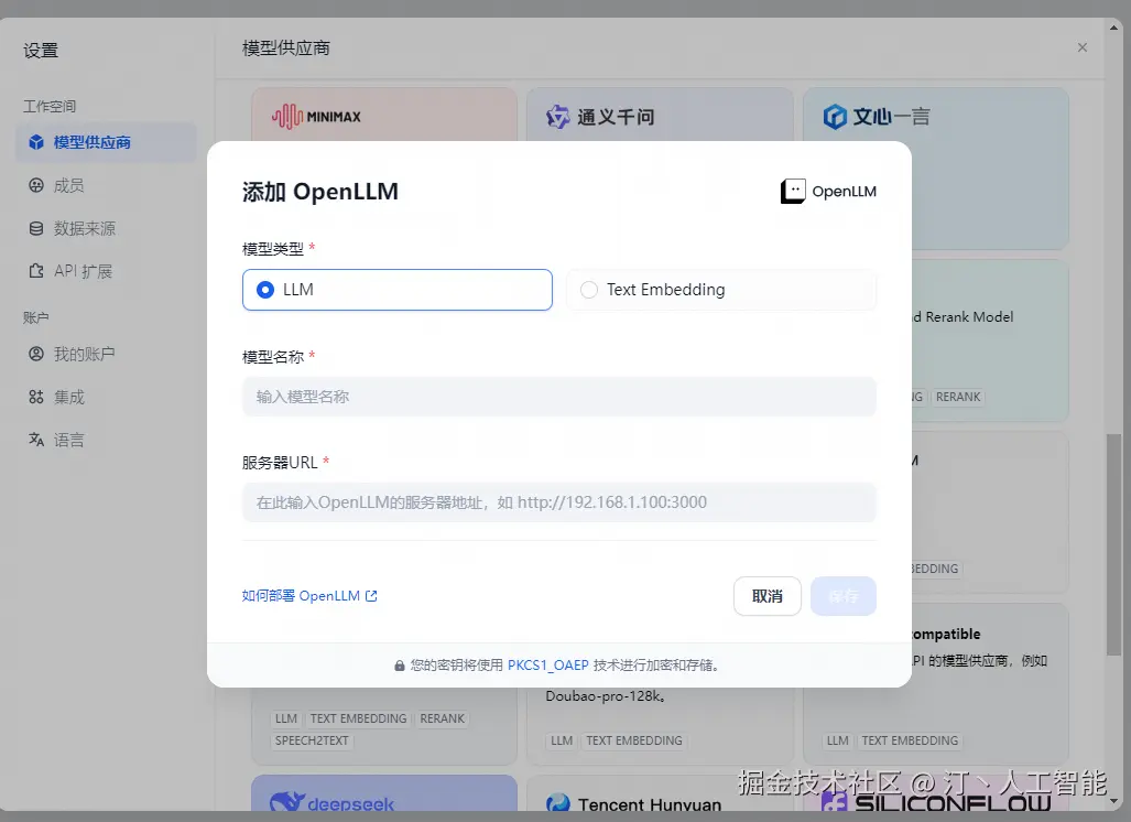 Embedding 模型接入方式与 LLM 类似,只需将模型类型改为 Text Embedding 即可。