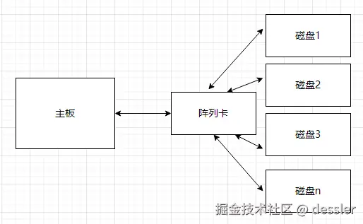 在一般的品牌服务器里面基本上都有一个叫阵列卡的硬件,硬盘先连接到阵列卡上面,然后阵列卡再连接到主板上,大概就是下面这样的。