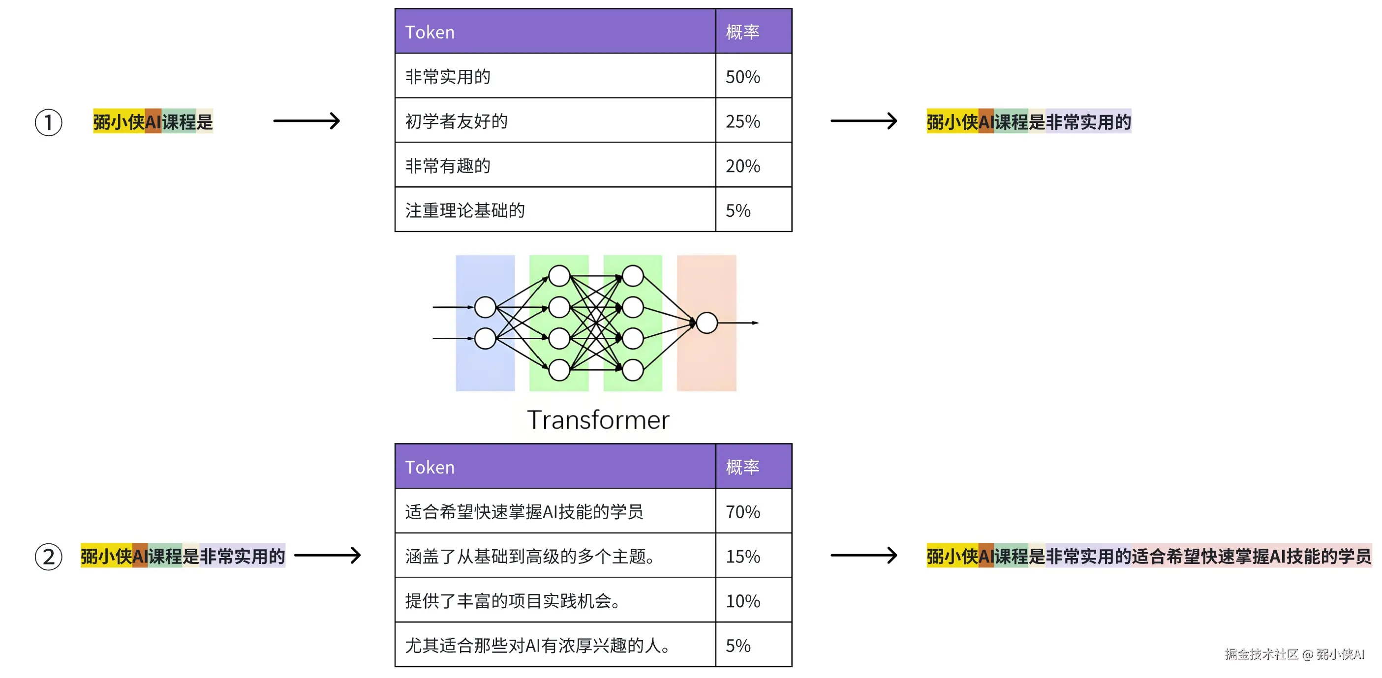 - 自回归过程:然后,作家把这个新预测的词“非常实用的”加到之前的句子中,变成“弼小侠AI课程是非常实用的”,接着再根据这个更新后的句子继续猜测下一个词。