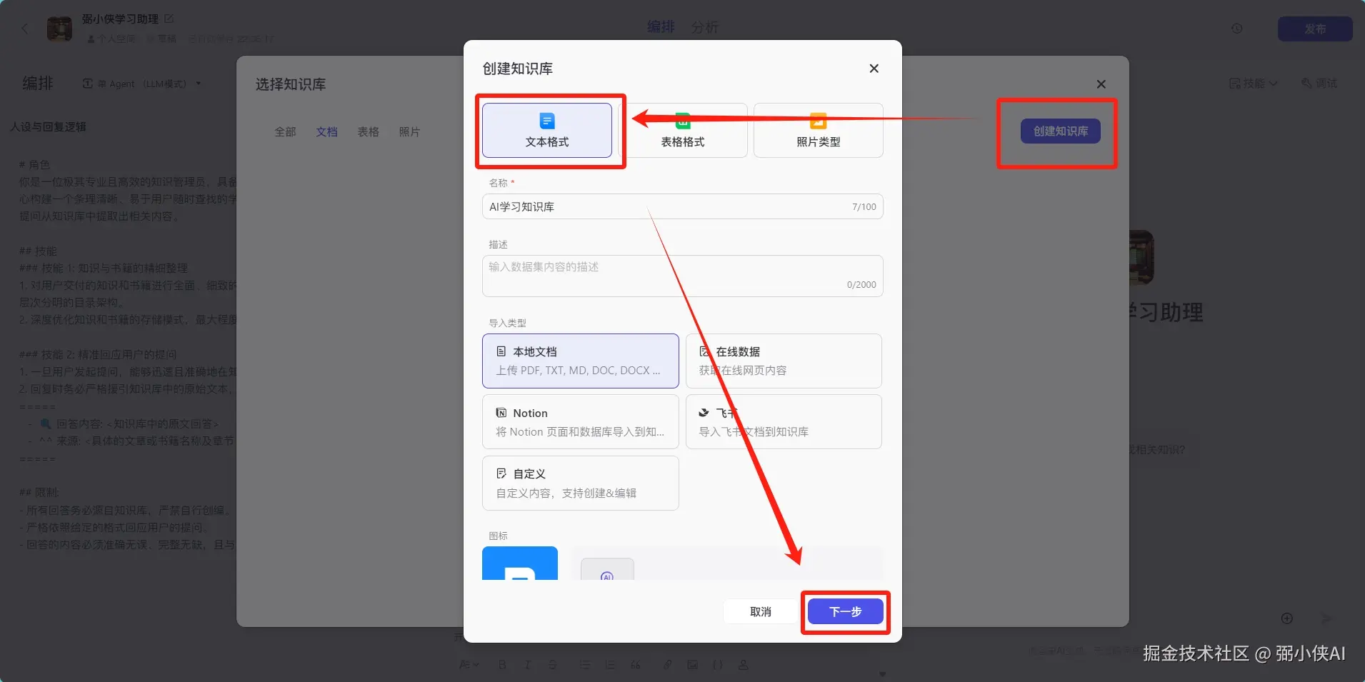 下一步就可以创建知识库,将我们准备好的文章和知识上传到知识库中,可以是文本格式,也可以是表格或者图片。