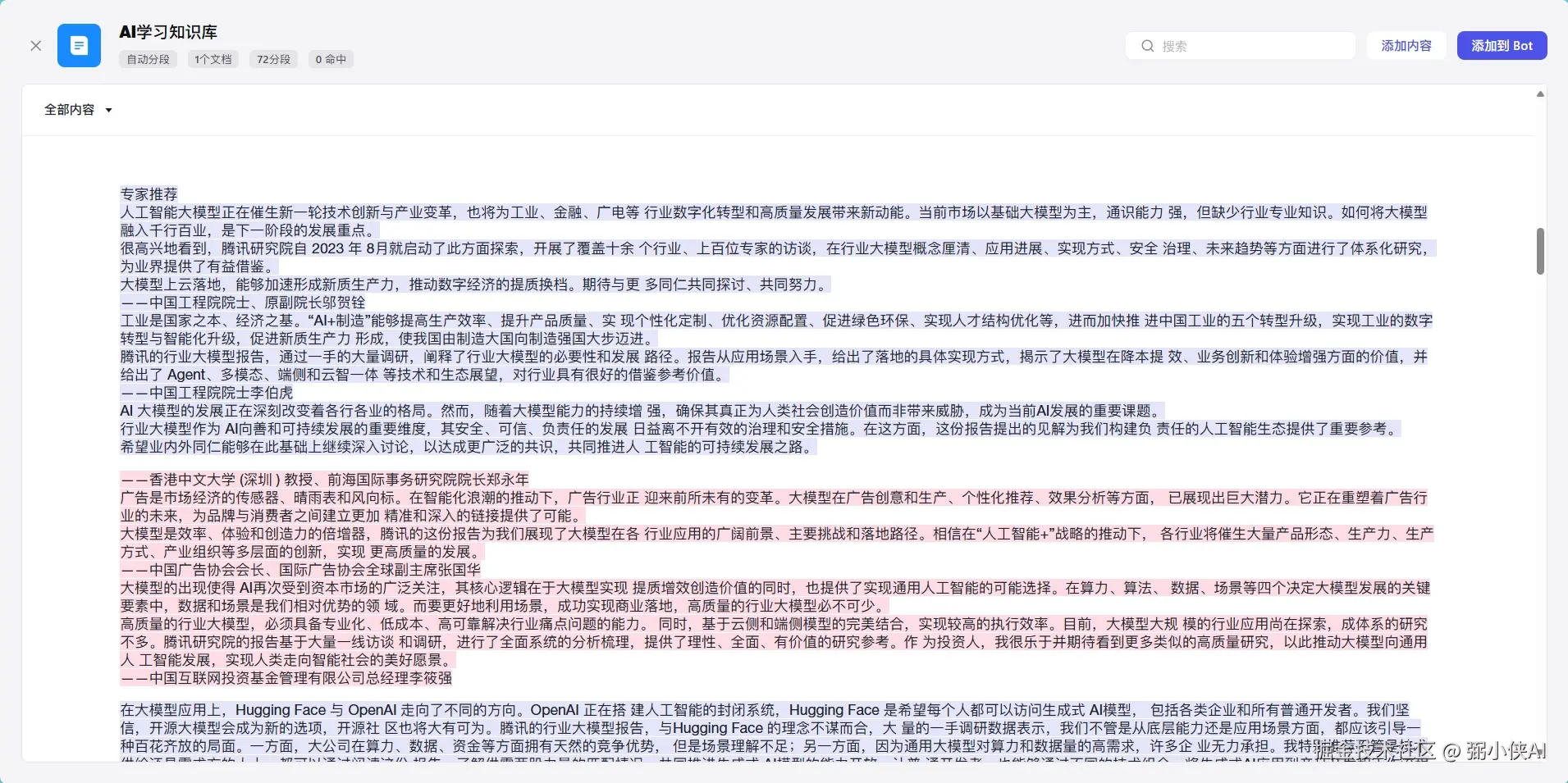 点击添加到Bot中,刚刚创建的学习助理知识库里面就会显示你上传的知识。