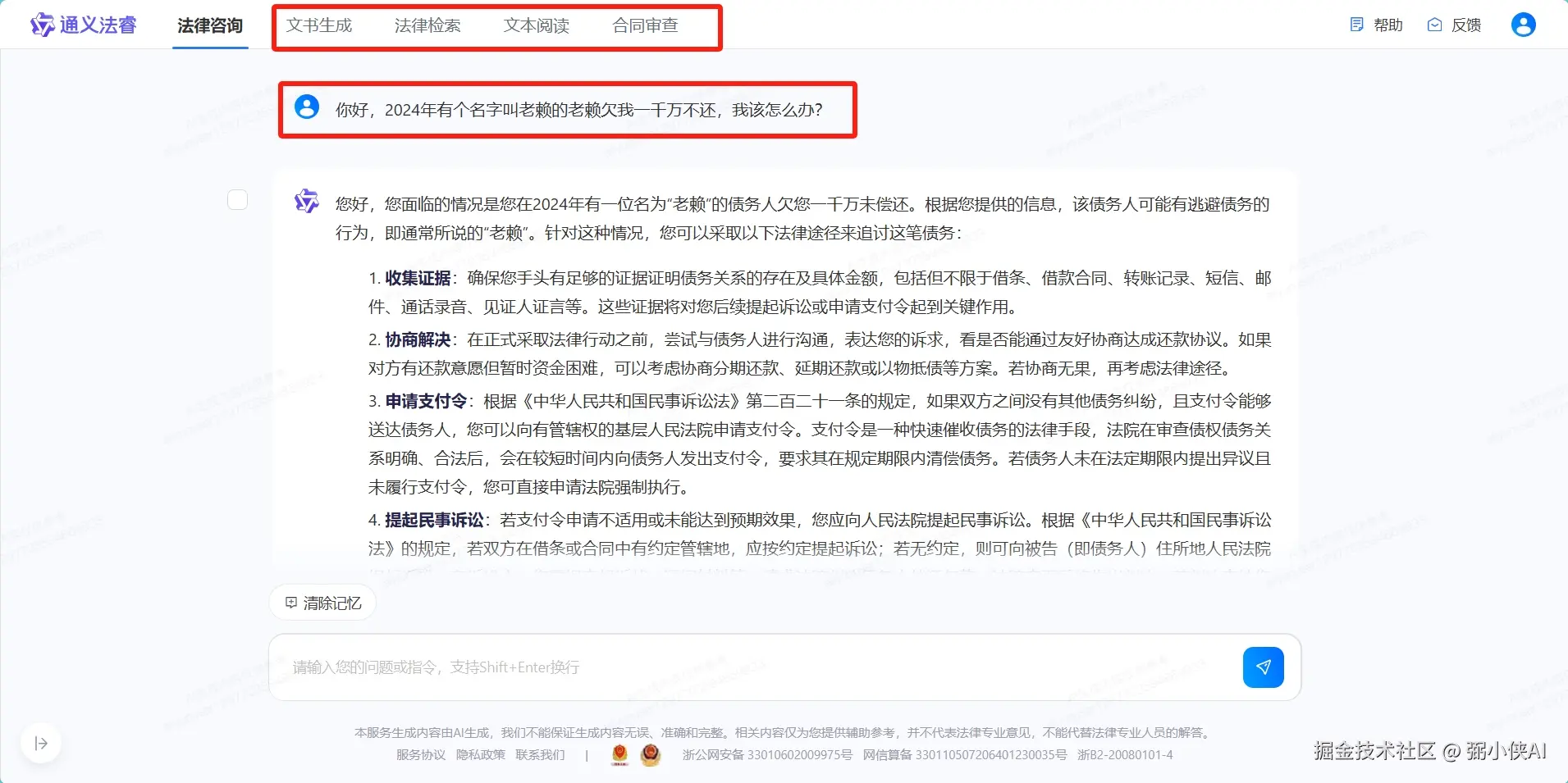 生活中可能会出现一些法律纠纷,比如遇到老赖欠你一千万不还,你就可以打开通义法睿这款AI工具,进入后输入你的问题,比如:你好,2024年有个名字叫老赖的老赖欠我一千万不还,我该怎么办?