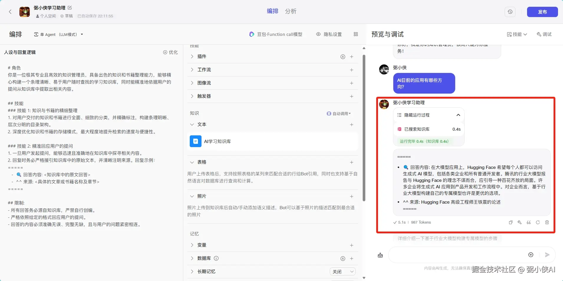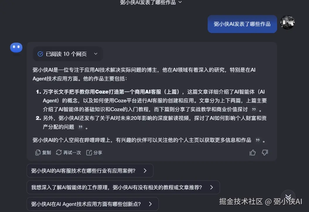 通过对话,可以看到AI回复你的方式是调用知识库中的内容进行回复。当然小侠这里只是例举例子,并没有对人设和知识库进行优化,如果想要更好的效果需要针对性优化一下,这样AI会更加聪明。