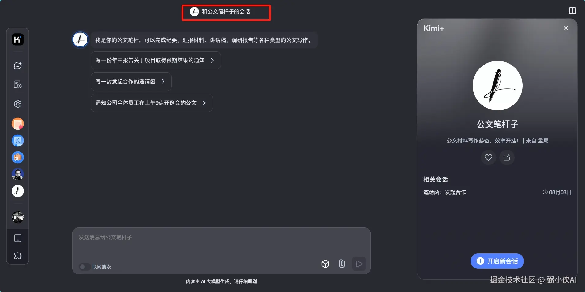 拿kimi来举例,打开kimi主页,点开kimi+,选择公文笔杆子会话: