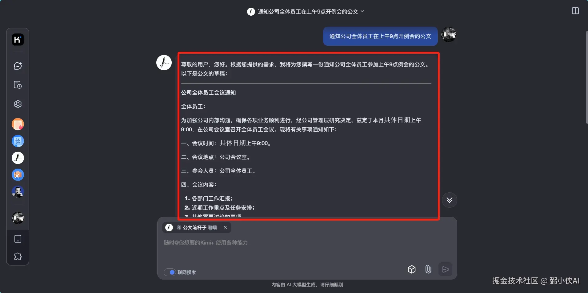 假设你要撰写一个公司会议通知,输入:通知公司全体员工在上午9点开例会的公文,AI就能刷刷刷帮你整理一篇通知文稿,具体效果如下: