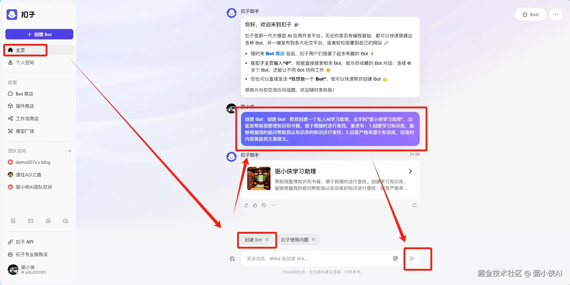 打开coze开发平台,点击主页。在主页对话框中选择创建Bot,输入: