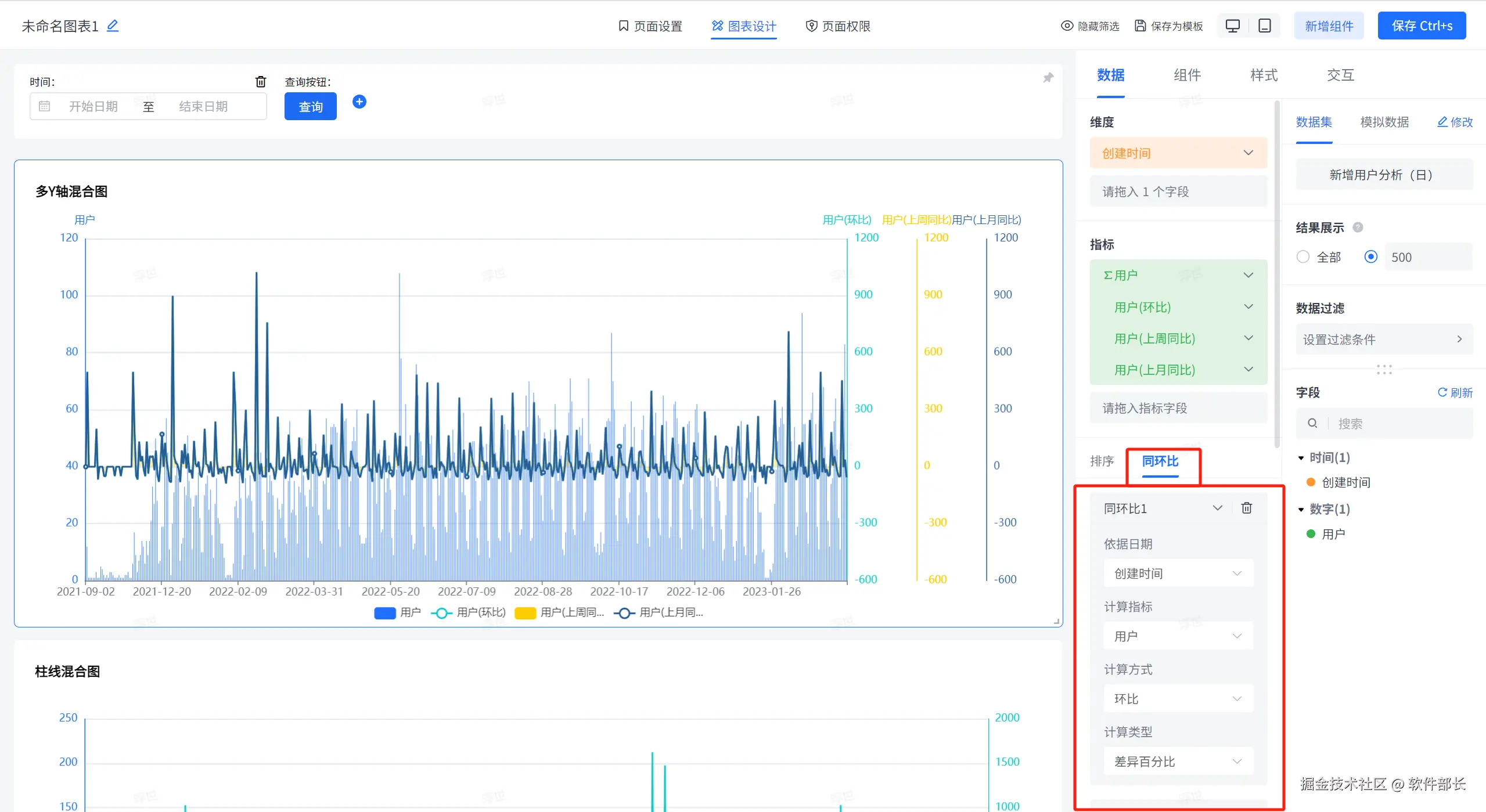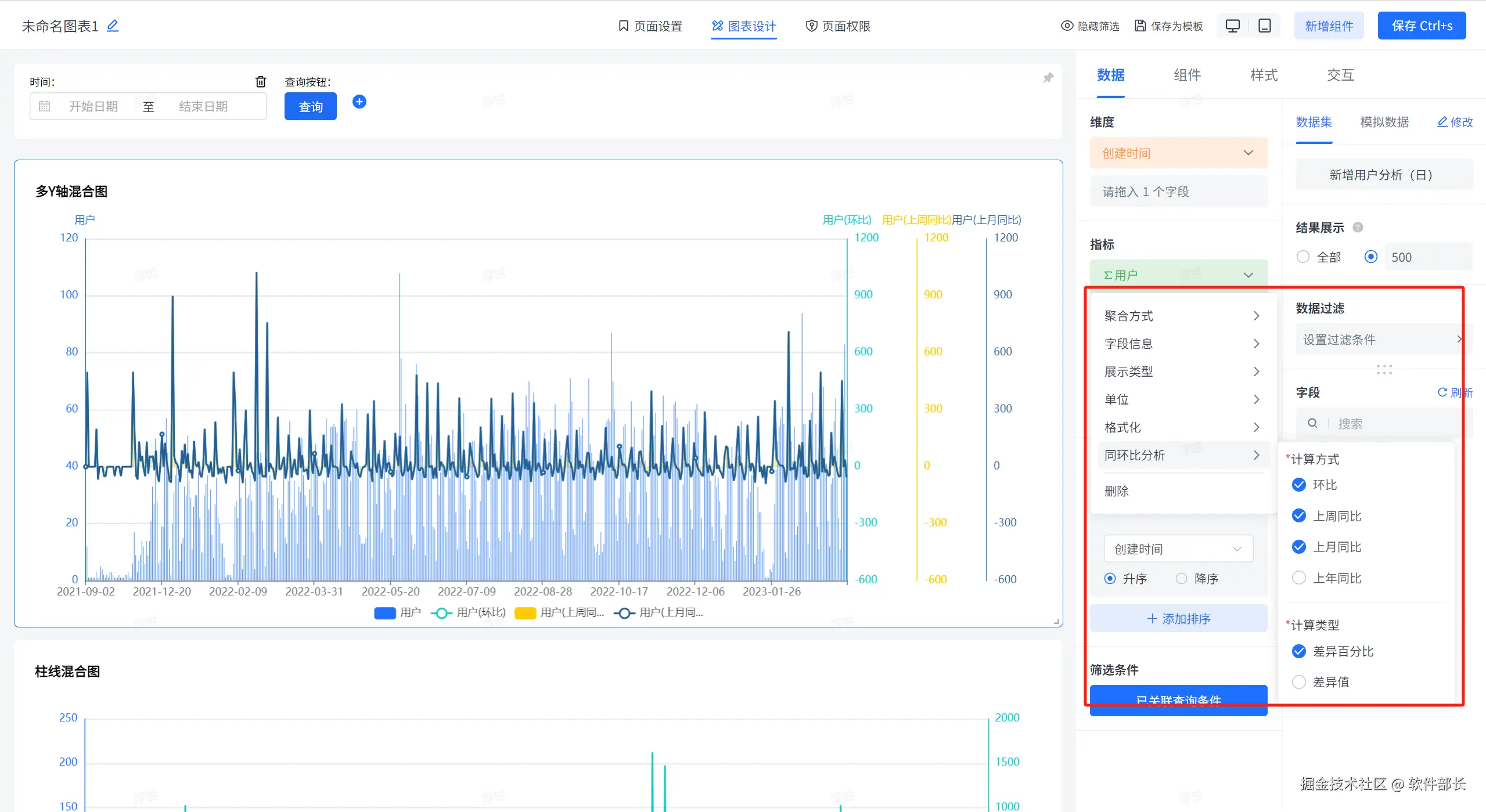 图表渲染的时候,提供同环比的配置能力,需配置同环比计算的依据,计算的指标,同环比模式,与计算结果等。