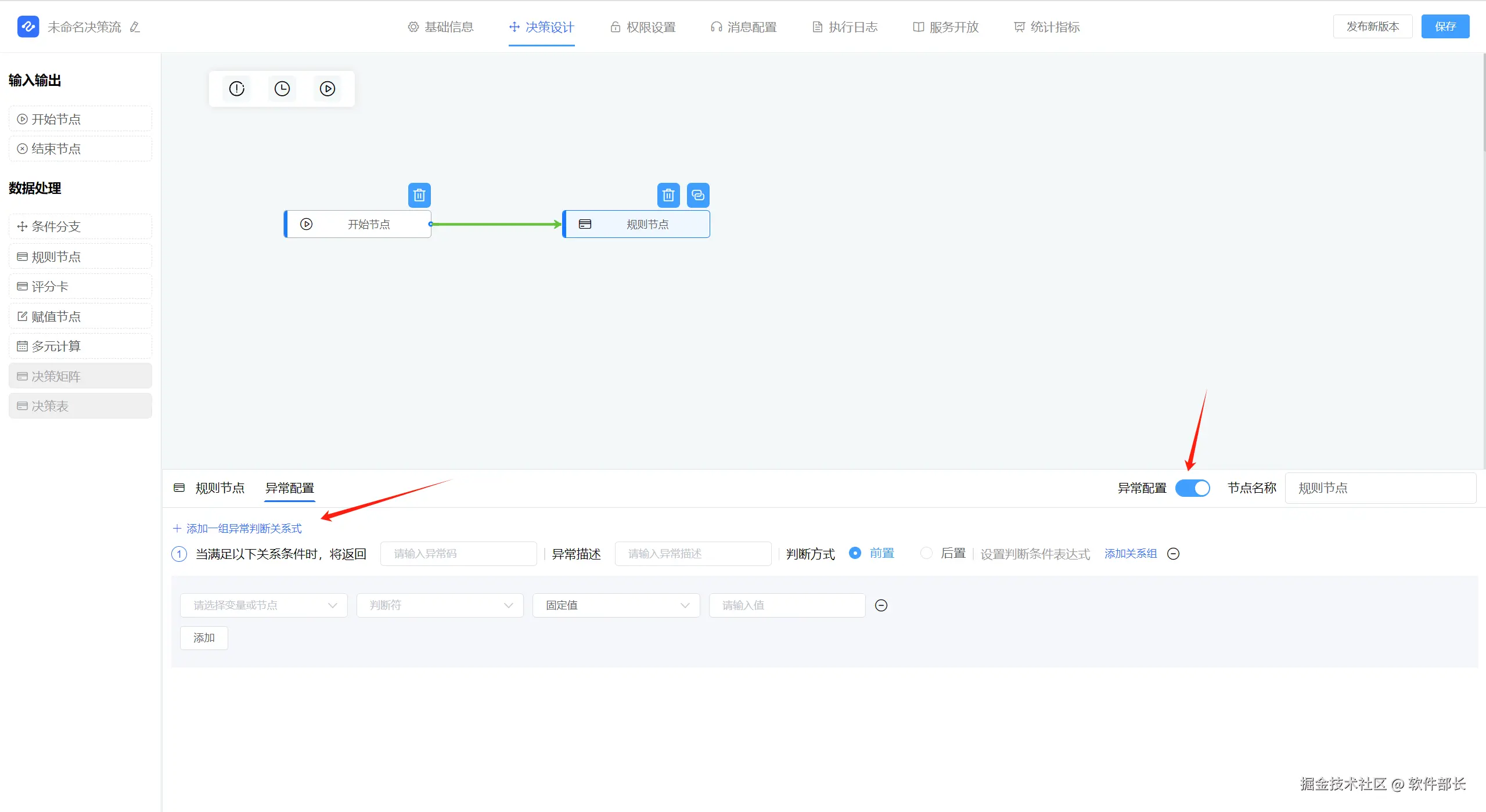 1、每个规则节点中,当某种业务判断命中的情况下,可以触发异常,反馈给业务系统自定义异常码,并且结束决策流,主要用于业务层级自定义异常反馈。