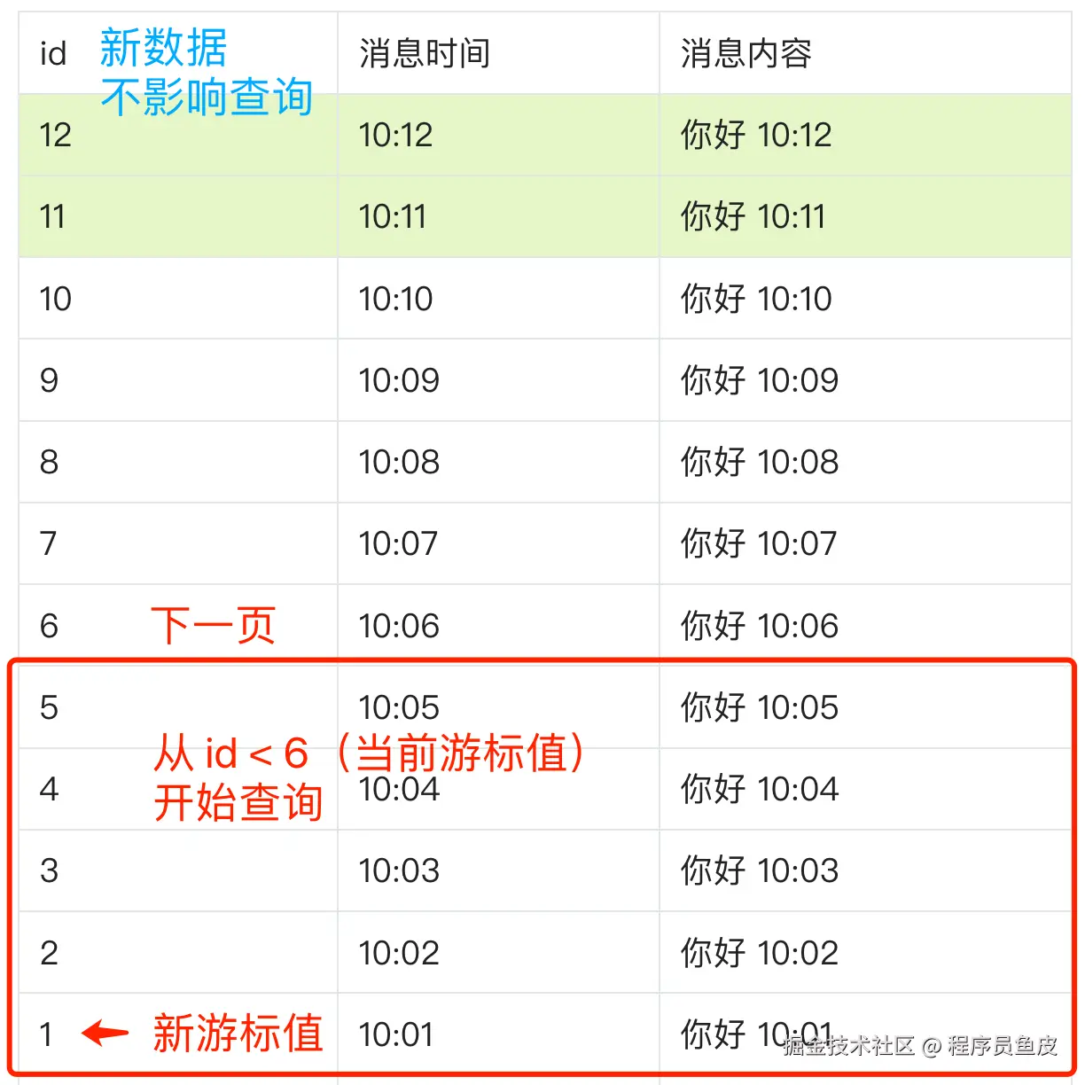 当要加载下一页时,前端携带游标值发起查询,后端操作数据库从 id 小于当前游标值的数据开始查询,这样查询结果就不会受到新增数据的影响。