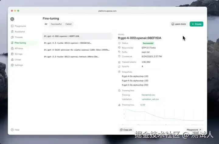 确保数据集上传正确后,就可以创建微调作业,可以通过界面化或者编程的方式来创建微调作业。示例如下: