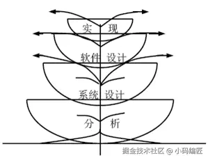 对于大型软件,只开发一个原型往往达不到要求。螺旋模型将瀑布模型和增量模型结合起来,并加入了风险分析。它是由TRW公司的B.Boehm于1988年提出的。