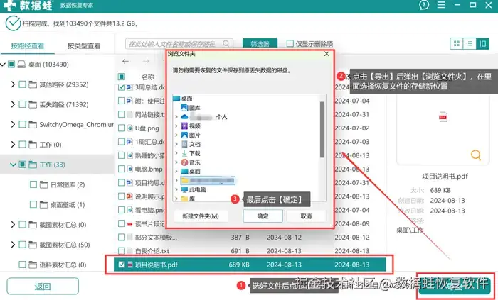 第4步: 勾选好目标文件后,点击右下角的【导出】,然后在【浏览文件夹】里选择存储的新位置就能完成误删文件的恢复。