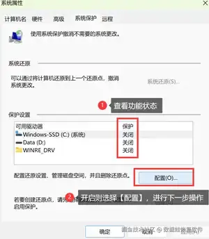 第2步: 在【系统保护】页面可以查看电脑文件保护功能的状态,如开启,点击【配置】后继续操作;未开启可以选择跳过这个方法。
