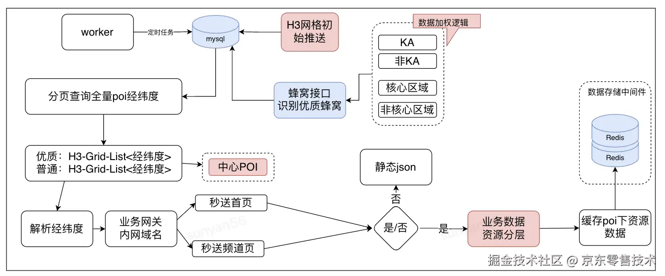 通过网格中台提供的JMF组件,通过H3空间索引算法,异构出精度7、精度8的两套六边形网格数据,并且调用网格热点接口来标识出当前网格的热点poi经纬度,录入至mysql中。以供worker异构的时候去查询基础网格经纬度数据库表。