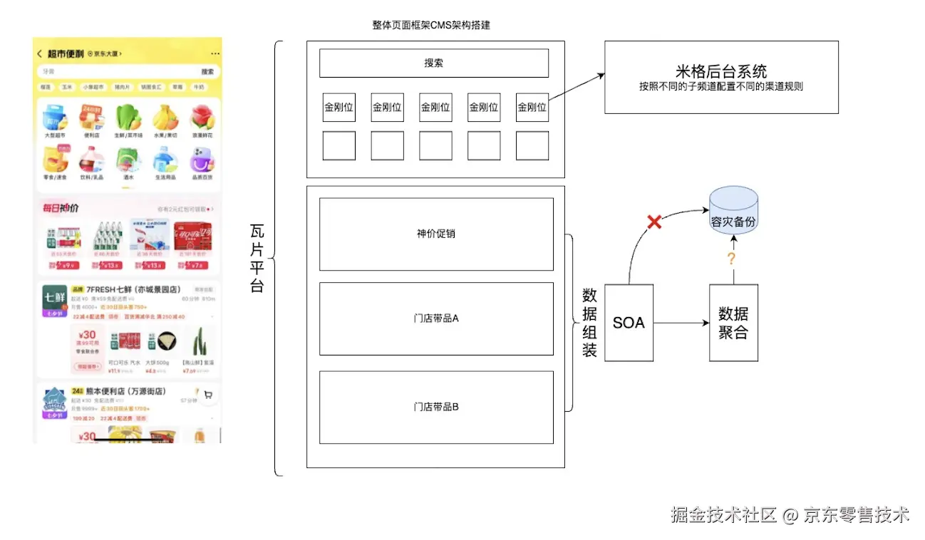 首页和频道页充当着网站的主入口,它们利用CMS系统和定向投放系统实现了基于地理位置服务(LBS)的楼层内容过滤。网站内容通过商品组合、广告组合以及推荐机制构建,核心资源主要依赖于推荐系统的数据池。我们分析后注意到,不同用户在同一地点或同一用户在不同地点可见的内容各不相同,这主要是由推荐系统的数据池结合特定策略实现的。推荐数据所依赖的因素来源于多种策略的分配,而这些策略因素又会反过来影响推荐结果。这导致我们无法仅通过备份当前数据来保持数据的一致性,因为策略的即时变化可能会使备份数据的结果发生变化。若要备份数据与线上数据完全一致,我们需要复制一整套推荐系统的数据流转过程,这是目前的一个难点。为了应对这种情况,我们采用了一个通用账号执行普通策略来进行数据备份,以尽可能排除变量因素,虽然这牺牲了一定的个性化推荐能力,但确保了数据正常展现。