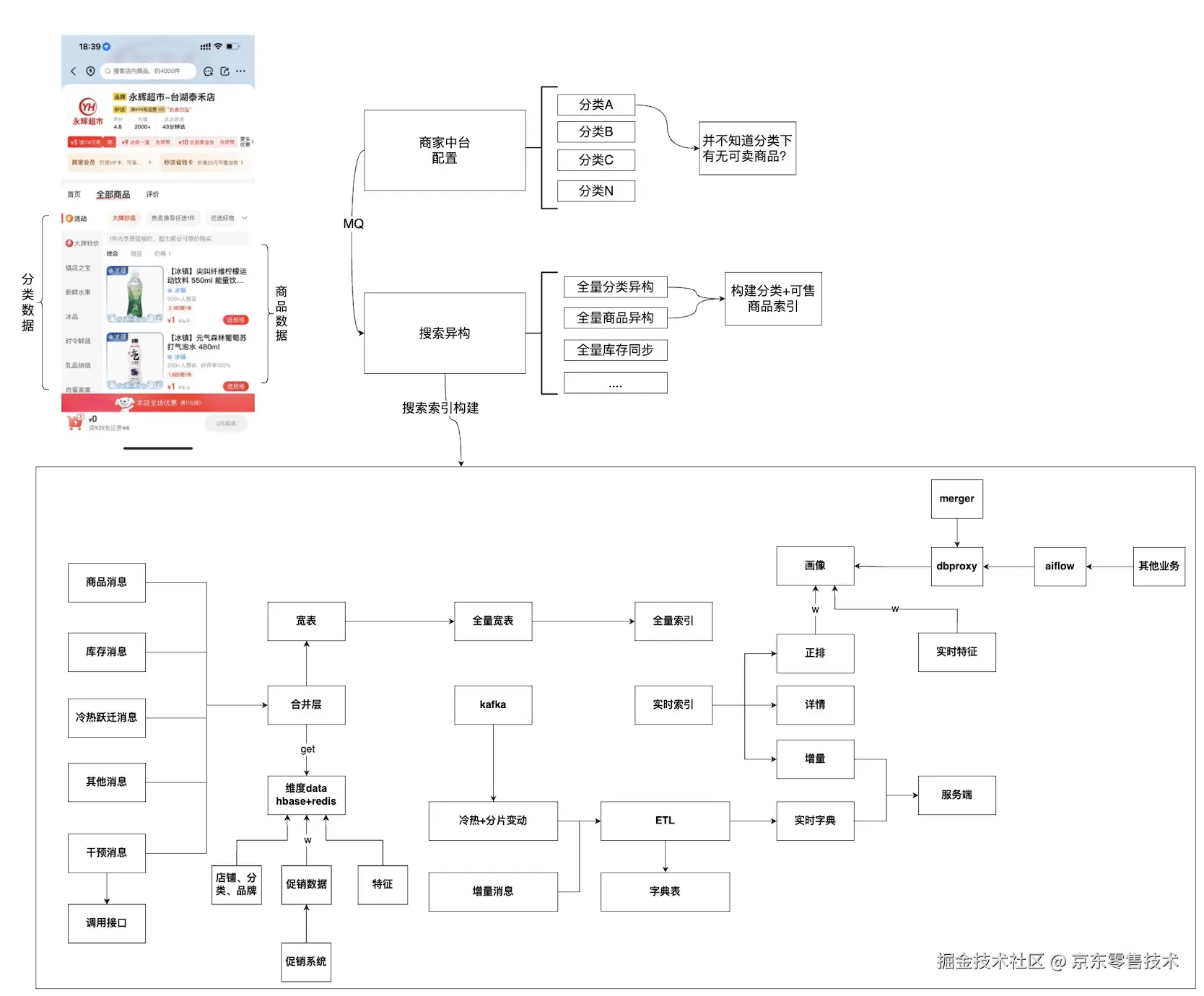 门详页是秒送流量的关键交易通道,其核心门店分类和商品信息均通过搜索引擎和商家分类中台获得。尽管集团的主搜索引擎已经分离出专门的垂直搜索服务供秒送场景使用,但数据源仍然是共用的,区别仅在于网关层面的分离。与首页和频道页不同,门详页专注于门店层面的分类和商品数据,不需涉及广告投放和目标人群等因素。只要门店能在首页展示,用户点击进入后看到的分类和商品就会保持一致。因此,我们的主要关注点是确保当前搜索引擎的数据源是准确的。我们对线上100家不同类型的门店(包括连锁品牌和非连锁品牌)进行了一周的观察,发现门店分类变动较少,而分类下的商品状态和库存变化较频繁。基于此,我们可以对门店分类实施全量缓存(考虑到较低的时效性需求),而对于分类下的商品则根据情况实施缓存(需要较高的时效性)。