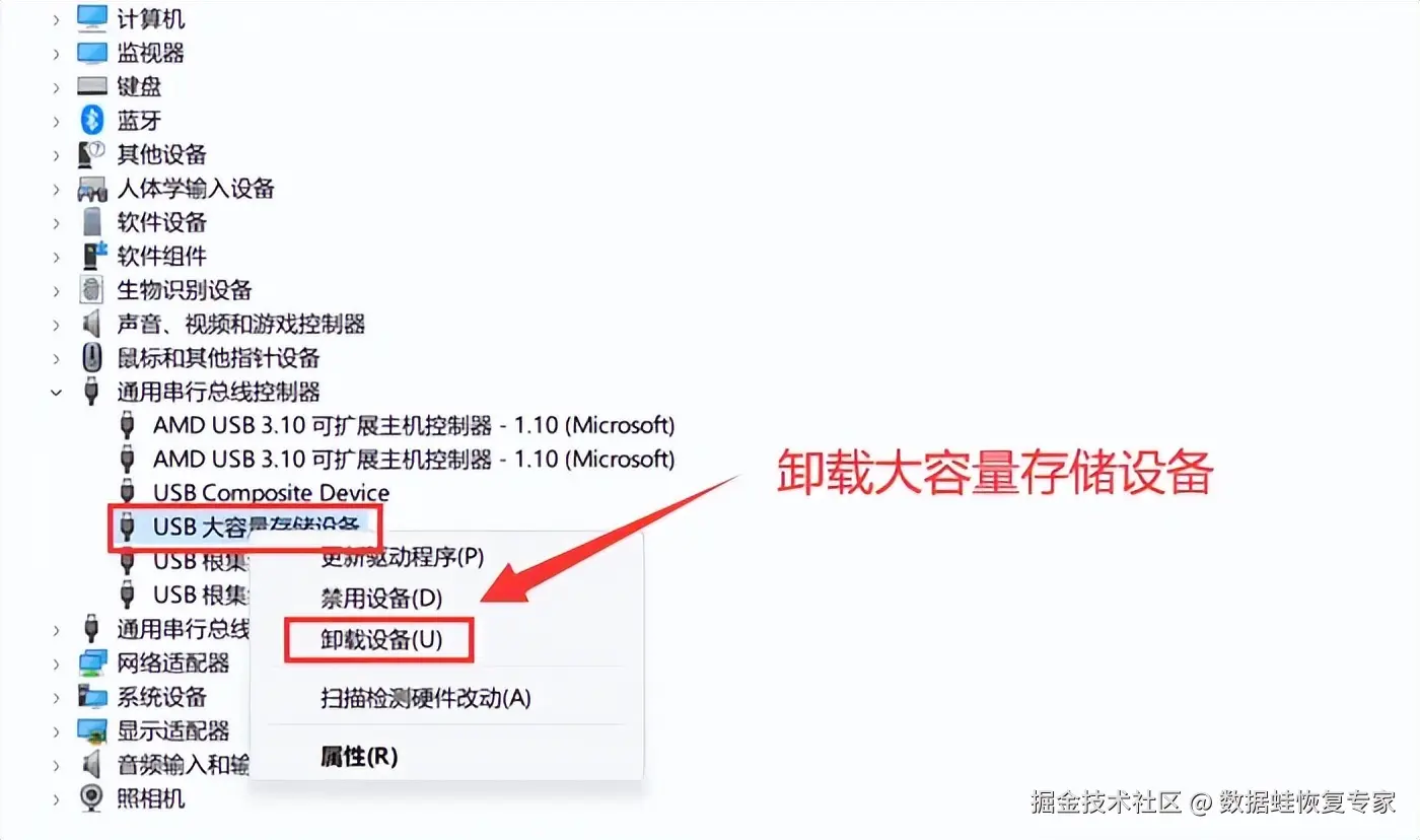 有时电脑中安装了大容量存储设备的驱动程序,有时也可能导致U盘无法正常显示。这种情况通常表现为U盘已经插上,但是无法识别。你可以尝试卸载该程序,让U盘重新被识别。具体做法为:进入设备管理器,找到 【通用串行总线控制器】 ,点击 【USB大容量存储设备】 ,进行设备卸载。