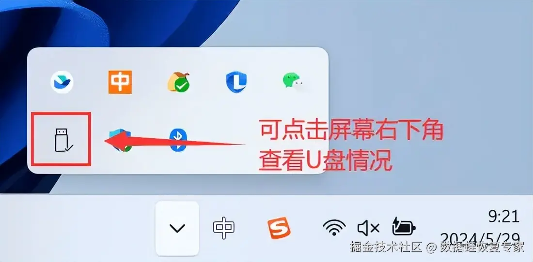 正常情况下,当我们将U盘插入电脑的接口时,屏幕上会自动弹出类似 【U盘已插入】 的提示。如果没有,不妨点击右下角,尝试进入U盘。具体如下图所示: