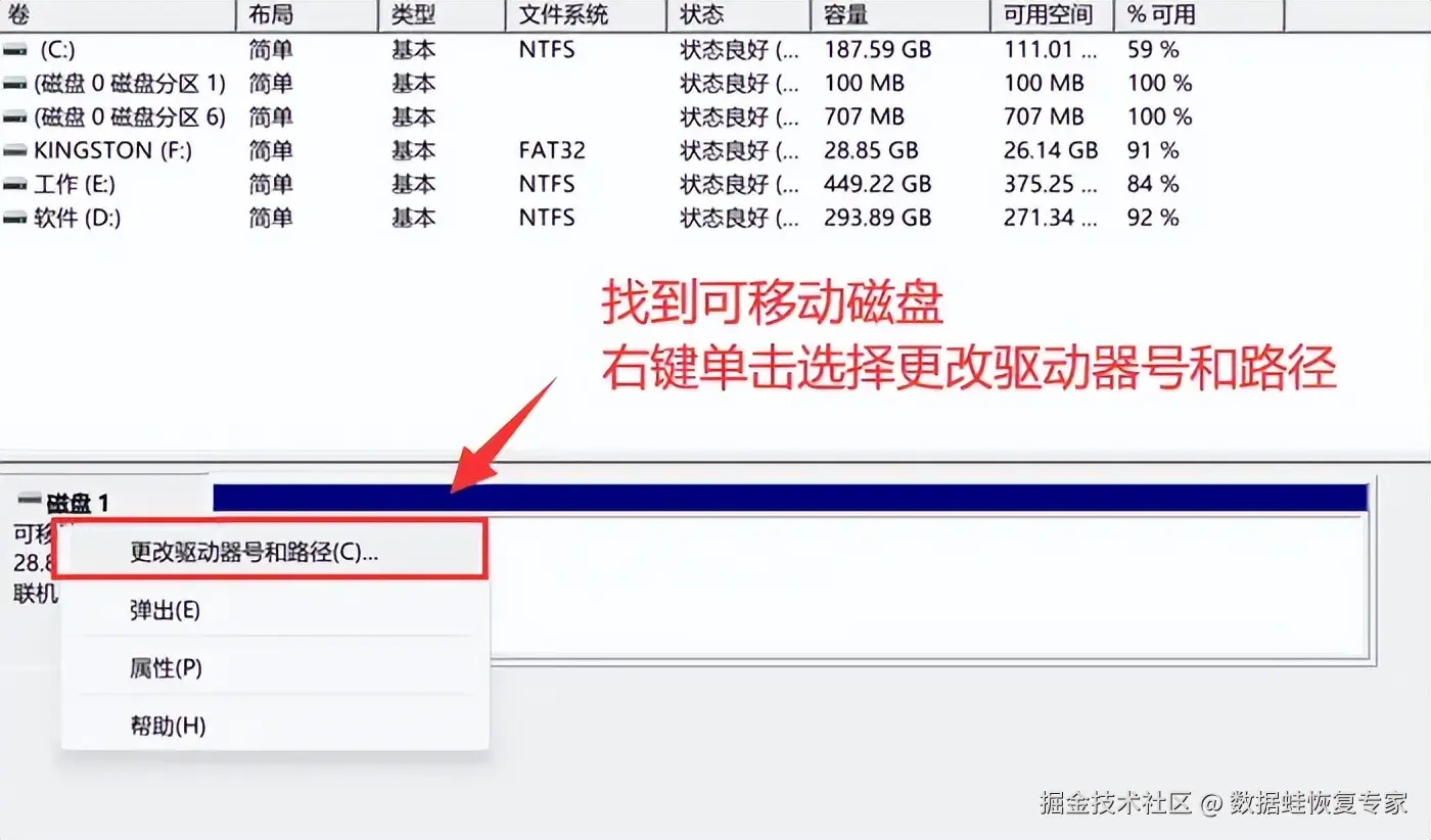 第二步:找到U盘所在的磁盘分区,一般显示为 【可移动磁盘】 。单击右键,选择 【更改驱动器号和路径】 。