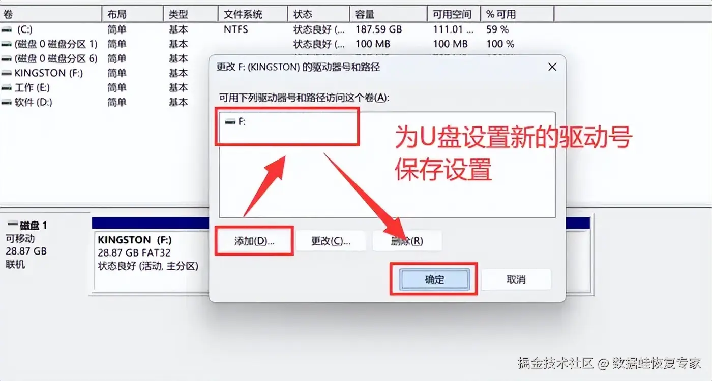 第三步:在弹出的窗口中,选择 【添加】 ,然后为U盘分配一个未被占用的驱动器号。最后,点击 【确定】 ,保存设置,再拔出U盘重新插入即可。