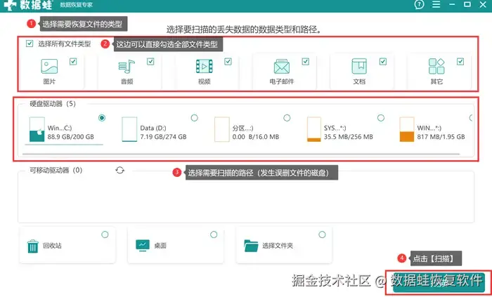 第1步: 打开软件,在页面选择需要扫描的文件类型(建议直接勾选全选)和需要扫描的路径(误删文件的位置),最后单击【扫描】。