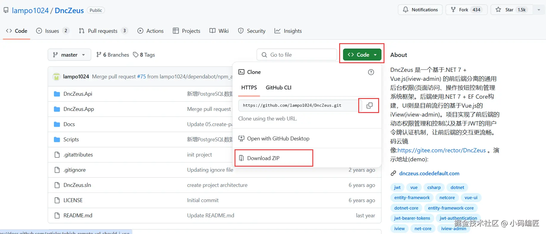 打开地址 https://github.com/lampo1024/DncZeus,找到页面中"Code" 的按钮点击,然后在弹出的对话框中点击"Download ZIP" 按钮,即可下载 DncZeus 的源代码,具体如下图所示: