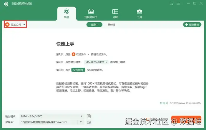 Step 1:进入数据 蛙视频转换器,点击 【+添加文件】 ,选中目标视频。