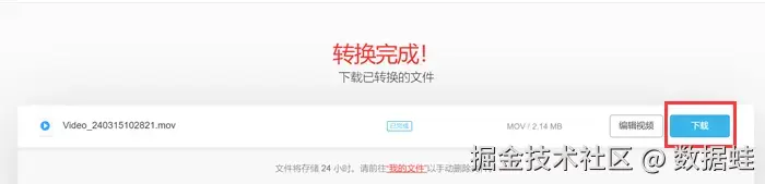 Step3:在选好视频和格式后,点击红色的 【转换】 键上传视频,转换完成时可点击 【下载】 ,保存视频。