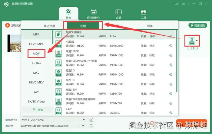 Step2:我们在生活中经常会有关于视频转换的疑问。怎么转换视频格式?点击右上方图标下的 【设置】 ,在选择栏目选择 【视频】 类,点击选择您想转化的格式。小编选择的是mov格式,大家根据自己需要选择就好~