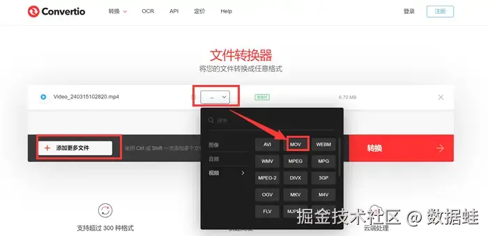 Step2:选择好目标文件后,点击右边的 【…】 ,点击 【视频】 类,选择您要转换的文件格式。因为小编原本的视频格式是mp4,小编选择把视频转换成mov格式,大家可以选自己需要的格式进行转化。如果需要转换的视频不止一个的话,可以点击左边的 【+添加更多文件】 完成批量转换。