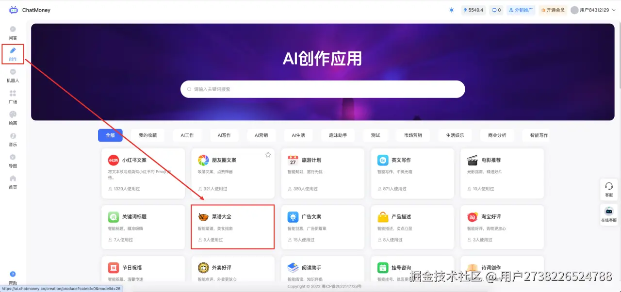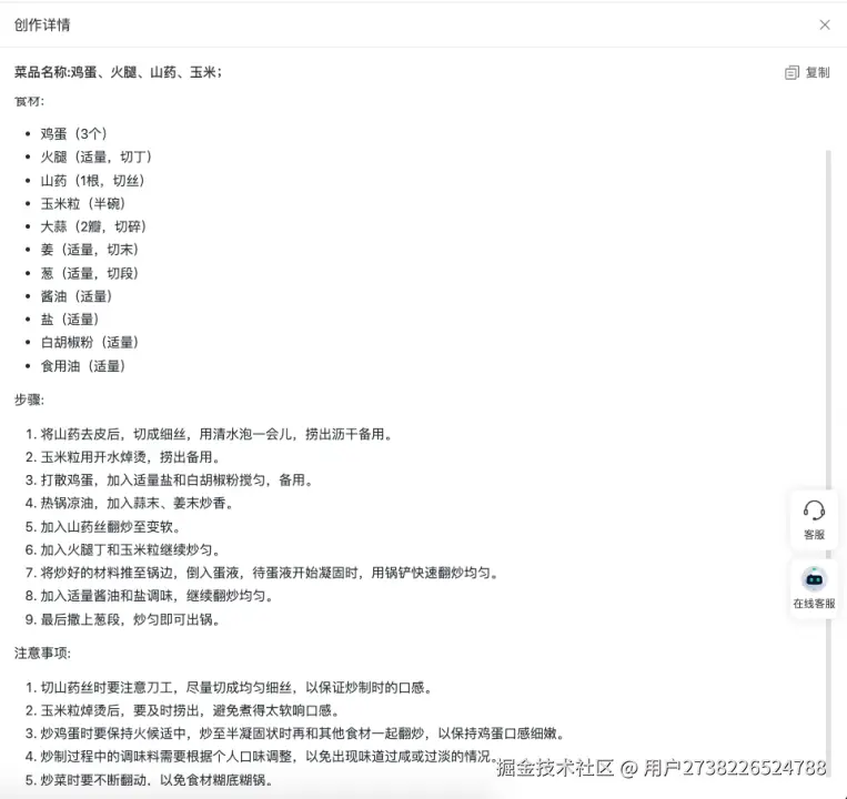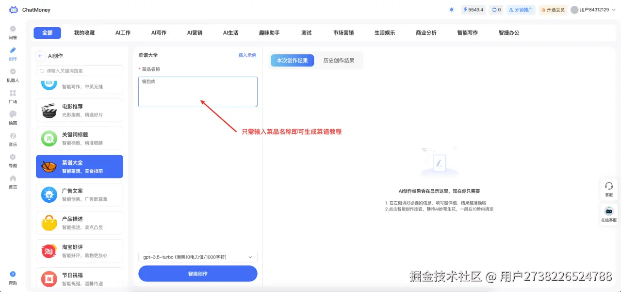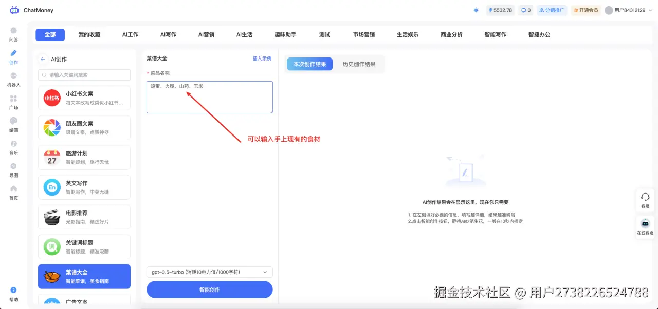 打开ChatMoneyAI全能AI知识库系统里的创作,选择AI菜谱大全,把菜品名称输入即可生成。烹饪详情分别为:烹饪菜品所需用的食材,如果手上没有食材就可以按照提示的进行购买。烹饪步骤也非常详细,什么时候下哪种食材写的很详细;最重要的还有注意事项提醒,食材需要如何准备都会详细标出。