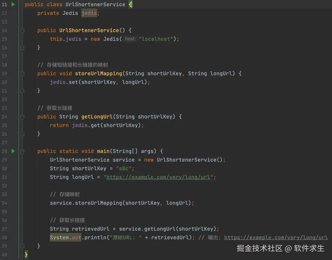 在这个示例中,我们使用Redis来存储短链接与长链接的映射。通过storeUrlMapping 方法,我们将短链接标识 sBc 和原始长URL存储在Redis中。然后可以通过 getLongUrl 方法来检索原始的长URL。