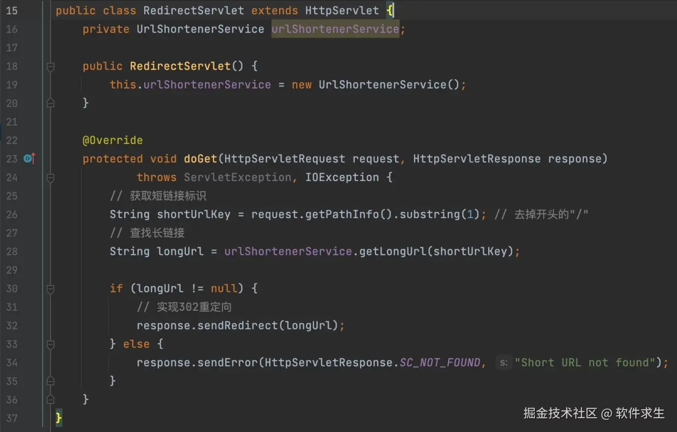 这个Servlet会根据用户请求的短链接标识,从数据库中查找对应的长URL,并使用response.sendRedirect(longUrl) 实现302重定向。如果没有找到对应的长URL,返回404错误。