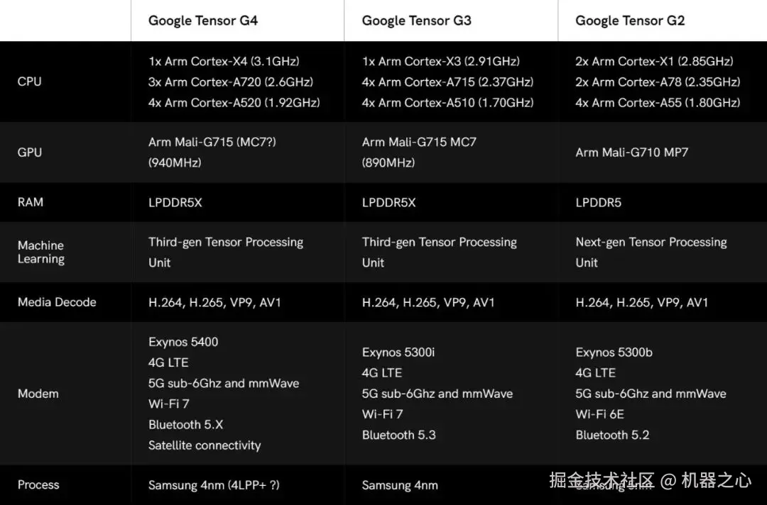 Tensor G4 由 Google DeepMind 设计,三星代工生产,使用 Arm 架构。经过优化,G4 可运行最先进的人工智能模型。它将是第一款运行多模态 Gemini Nano 模型的处理器 —— 仅在手机端侧,就可以实现大模型理解文本、图像和音频等任务。