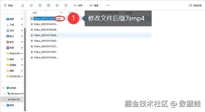 步骤3:修改后缀格式,如例子所示,我们直接把视频文件的后缀名mp4改成mp3。