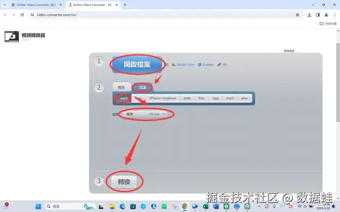步骤3:在圆圈 【2】 栏选择你要转换的格式。因为我们要把mp4文件转换成mp3,选择 【音讯】 ,点击 【mp3】 。我们可以根据需求,在 【品质】 栏选择音质。小编没有特别的需求,就选择默认的 【标准128kps】 了。