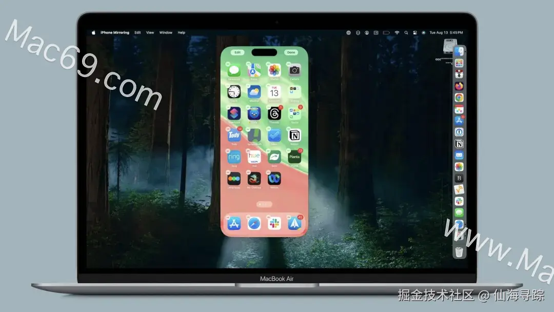 macOS Sequoia最大的更新是带来了iPhone 镜像功能,这个功能能让给 Mac 用户将 iPhone 的屏幕镜像到 Mac 设备上,实现与 iPhone 互动、在 Mac 上接收 iPhone 通知,以及在 Mac 和 iPhone 之间无缝拖放等等。