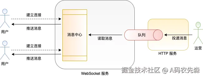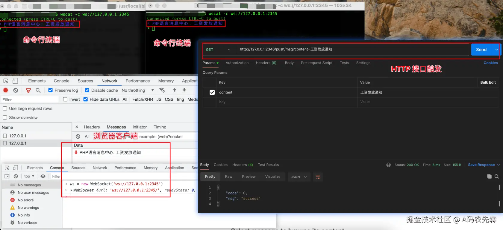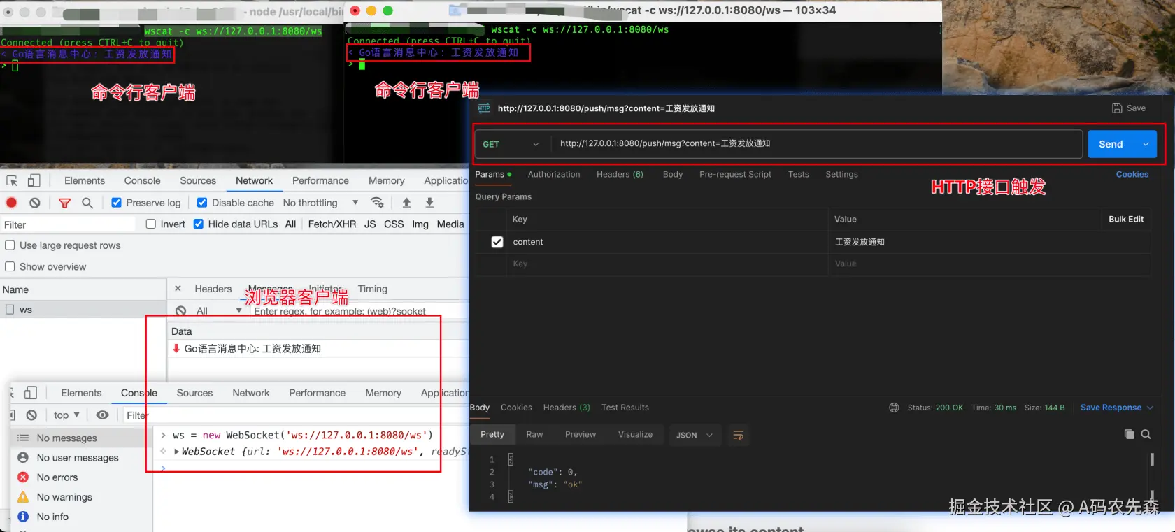 此外,在 PHP 中需要使用 Timer 异步定时器来读取 Redis 消息队列中的数据,不能用 for 循环或者 Redis 的阻塞队列,因为它会阻塞整个进程的执行。而在 Go 中直接开启一个协程,在协程中等待通道中的消息即可,会一直阻塞到消息的到来,而且它不会阻塞整个进程的执行,由此可见在这个例子中 Go 相较于 PHP 的优势显著。最后可能有些从来没有使用过 WebSocket 技术的朋友,可能看完这篇文章之后也依然会云里雾里,所以建议这些朋友可以自己亲自实践一下文中的案例,实践过后我相信你会别有一番技术体验。如果有想要获取完整案例代码的朋友,可以在掘金内私信我回复「2463」即可,希望对大家能有所帮助。