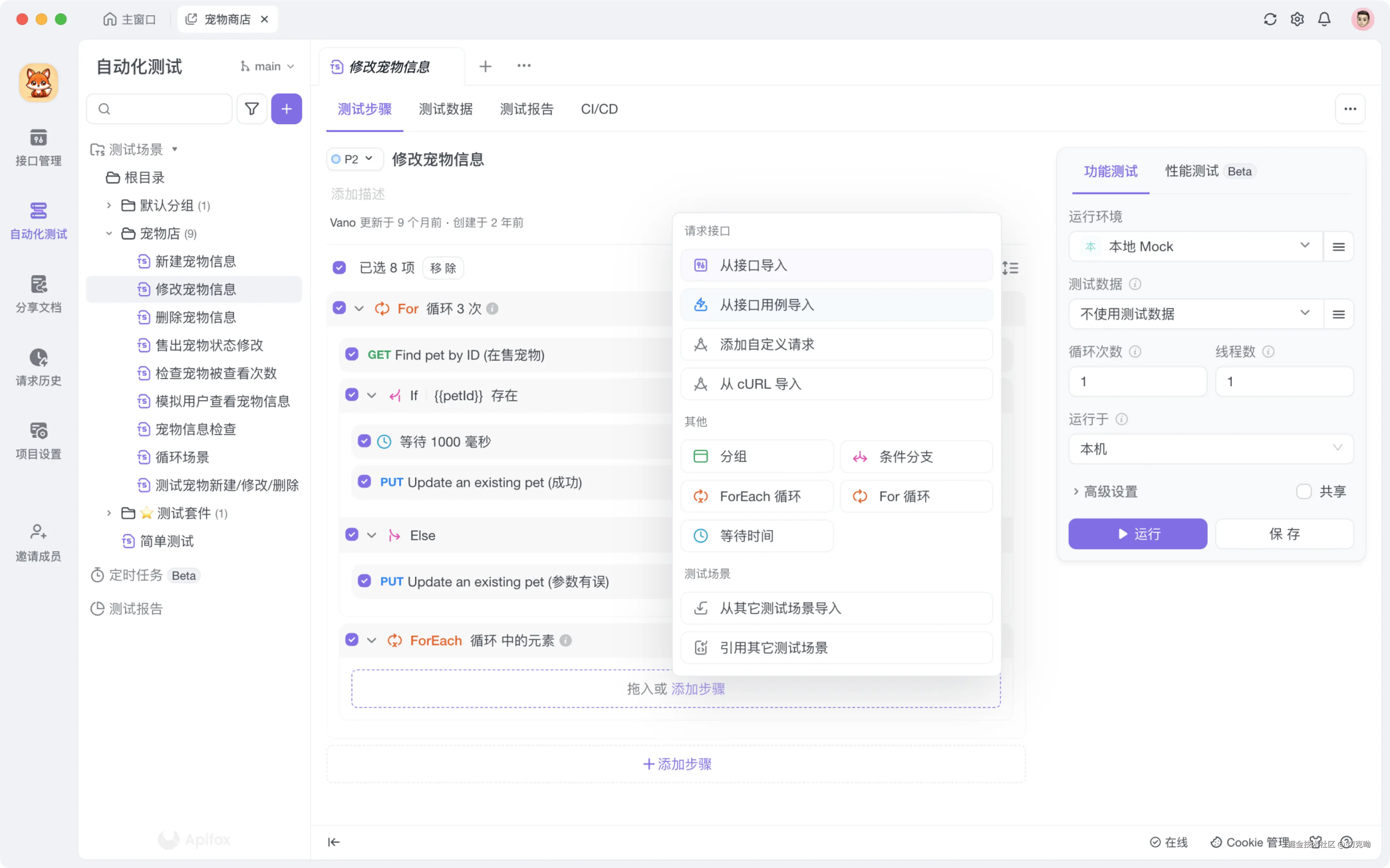 Apifox 自动化测试模块可以快速添加流程控制条件,包括条件判断(If)、数组循环(ForEach)、等待(Wait)、分组(Group)等。当业务需要多种判断时,流程控制可用于控制测试步骤的复杂执行顺序,更能模拟用户真实的使用场景,提升测试人员对复杂测试场景的工作效率。